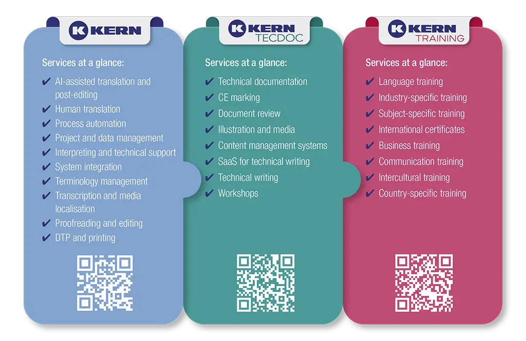 Mit über 50 Jahren Erfahrung und über 30.000 Kunden steht die KERN Group für Kompetenz und Zuverlässigkeit in der globalen Kommunikation. Unsere Mission ist es Ihnen schnelle, hochwertige und kosteneffiziente Lösungen anzubieten. Dafür vereinen wir Branchenkompetenz, muttersprachliche KommunikationsexpertInnen und technische Exzellenz. Mit über 45 Standorten weltweit sind wir nah an unseren Kunden. Im Trainingsbereich entwickeln mehr als 35.000 KursteilnehmerInnen Sprachkompetenz und internationale Handlungssicherheit. Gemeinsam machen wir globale Zusammenarbeit klar, sicher und wirkungsvoll.